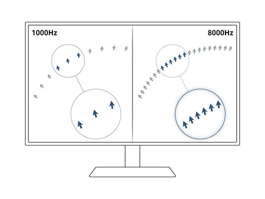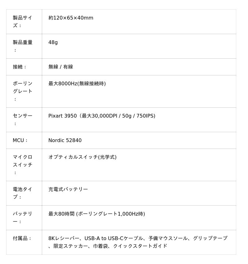 付属のワイヤレスドングルは8000Hzポーリングレートに対応。マウスの微細な動きも、PCへ1秒間に最大8000回という圧倒的な頻度で伝達します。これにより安定感と超低遅延の操作感を実現。コンマ1秒の反応が勝敗を分ける世界で、究極の精度を提供します。