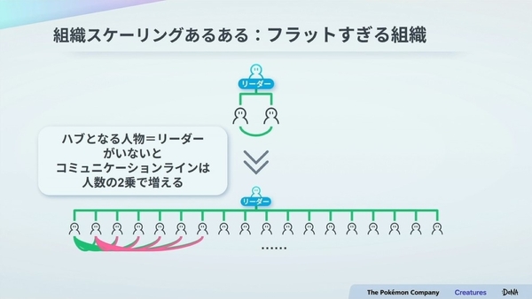 そうしてコミュニケーションラインが増えると、労力がかかるため、コミュニケーション自体が減少。また、責任がメンバー間に分散することで、オーナーシップも希薄化していった。「縦割りのないフラットな組織でも“縦割りのような状態”になってしまい、タスクの取りこぼしも発生し始める。やはり、一定規模以上の組織には、健全なピラミッド構造が必要」(今別府氏)