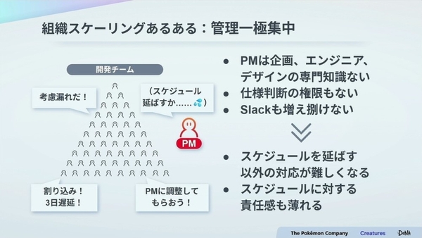 DeNAでは、メンバーが開発に集中できるよう、外部のPMがタスク管理やスケジュール管理を担うことが多かった。ただし、PMは専門知識がないため、仕様の判断権限を持たない。組織の人数が増えるにつれ、タスクの割り込みや遅延も多く発生するようになったが、スケジュールを延ばすことでしか対応できなくなり、次第にメンバーのスケジュールに対する責任感も薄れていく。