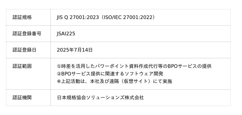 日本と海外の時差を活用し、クライアントのニーズに応じた業務ソリューションを提供する株式会社Timewitch(本社:東京都渋谷区、代表取締役CEO:岡田 崇 / 三浦 健之介、以下Timewitch)は、情報セキュリティマネジメントシステム(ISMS)に関する国際規格『ISO 27001』(JIS Q 27001:2023 / ISO/IEC 27001:2022)の認証を、2025年7月14日付で取得し、登録証を受領いたしましたのでお知らせします。