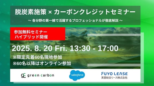 ネイチャーベースのカーボンクレジット創出販売事業を展開するGreen Carbon株式会社(代表取締役:大北潤、以下:Green Carbon(読み;グリーンカーボン))は、株式会社セールスフォース・ジャパン(代表取締役会長兼社長:小出 伸一、以下:Salesforce)と共催し、芙蓉総合リース株式会社(代表取締役社長:織田寛明、以下:芙蓉リース)をゲストで招待した「脱炭素施策×カーボンクレジットセミナー(以下:本セミナー)」を2025年8月20日(金)13:30~17:00で開催する事をお知らせします。