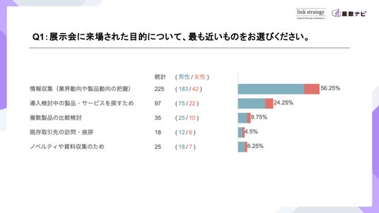 展示会来場者へのアンケートから目的や情報を知ったきっかけ、ブースに対する印象といった行動特性が明らかになりました。