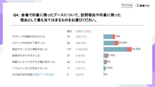 - 印象に残ったブースは、展示内容への興味、スタッフの対応、デザイン性が大きく影響