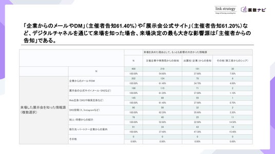 - 来場を決定づけた要因は、主催者や出展社からの直接的な案内や招待