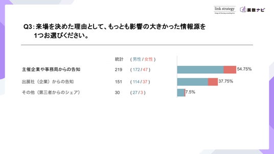 展示会への来場を決めた理由として、最も影響の大きかった情報源は「主催企業や事務局からの告知」で、全体の54.75%(219件)を占めました。次いで「出展社(企業)からの告知」が37.75%(151件)「その他(第三者からのシェア)」は7.5%(30件)にとどまりました。