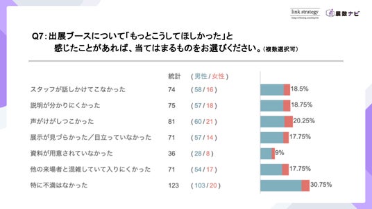 展示ブースに関する設問では、「声がけがしつこかった」(20.25%)、「説明が分かりにくかった」(18.75%)、「スタッフが話しかけてこなかった」(18.5%)など、接客や説明に関する回答が多く見られました。