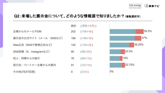 - 展示会を知ったきっかけは、企業の案内、Web広告、公式サイトなど複数の経路