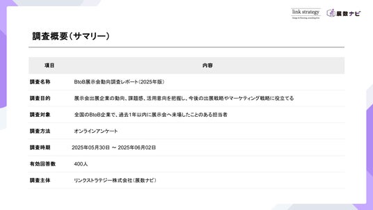 リンクストラテジー株式会社は展示会に来場したビジネスパーソン400人を対象に、展示ブースの印象や訪問理由に関するアンケート調査を実施しました。本調査は、展示会における出展企業と来場者の意識のギャップを可視化し、今後のブース設計や集客施策に役立てることを目的としています。