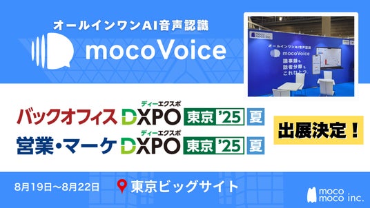 mocomoco株式会社(代表取締役CEO 田中康紀、以下 mocomoco)は、オールインワンAI音声認識「mocoVoice」を、2025年8月19日(火)~22日(金)に東京ビッグサイトで開催される「バックオフィスDXPO 東京'25」および「営業・マーケDXPO 東京'25」に出展いたします。