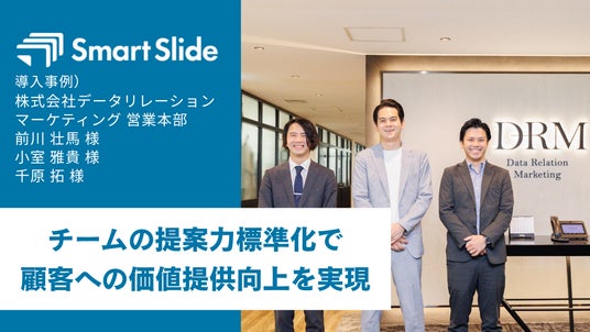 属人的で難しいとされるソリューション営業を、提案資料の仕組み化でカンタンにする「SmartSlide」を展開する株式会社スマートスライド(東京都千代田区、代表取締役社長:白幡 健太郎、以下 「SmartSlide」)は、株式会社データリレーションマーケティング(本社:東京都豊島区、代表取締役:中川 淳一、以下「DRM」)が「SmartSlide」を導入し、属人的だった提案営業から脱却、組織全体の提案力向上を実現したことをお知らせします。