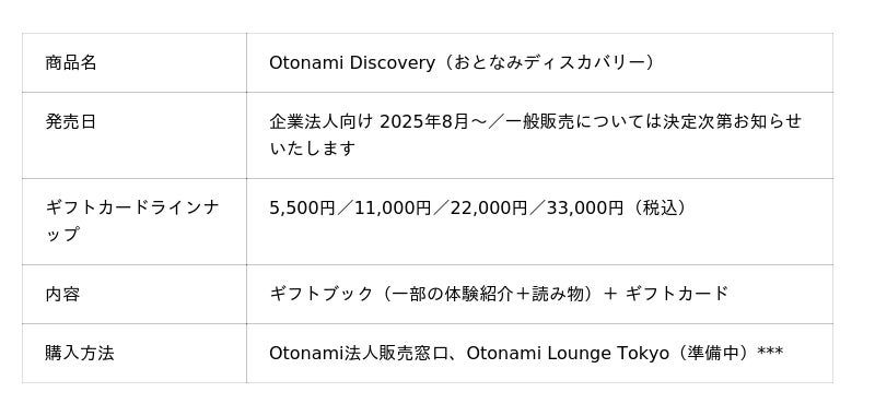 Otonami Discoveryは、ギフト選びに迷いがちな人にとっても、自由に選べる安心感と、思いがけない出会いの楽しさを兼ね備えた贈り物です。記念日や誕生日など個人的な贈り物として、感動が記憶に残る“コトギフト”の新たな選択肢として、Otonami Discoveryは体験ギフトのスタンダードを再定義します。
