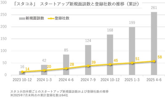 スタコネ社は、優良なスタートアップ企業とサポーターのマッチングプラットフォーム「スタコネ」を運営しており、「スタコネ」の提供開始から約1年半でサポーター会員数累計200名超を達成。各分野のプロフェッショナルや、スタートアップ企業支援に関心の高い「サポーター」との出会いの場を提供しています。また、スタートアップ企業の入会に際しては厳選した審査を行っており、これまで累計64社の成長性の高い企業にご登録いただいています。
