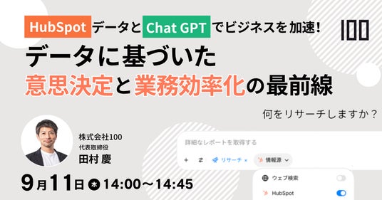 HubSpot Smart CRM(TM)の導入・運用支援を通じて、RevOpsソリューションを提供する株式会社100(本社:東京都世田谷区、代表取締役:田村慶、以下「100」)は、ChatGPTとHubSpotを連携させた新しいデータ活用アプローチを紹介する無料ウェビナー「HubSpotデータとChatGPTでビジネスを加速! データに基づいた意思決定と業務効率化の最前線」を開催いたします。