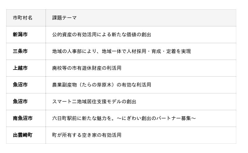 課題テーマの詳細は、チャレンジ新潟ホームページ「R7年度 参加市町村・地元企業一覧とその課題」にて公開しています。