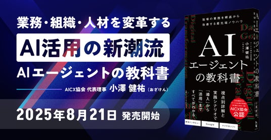 生成AI技術を活用したAIエージェントの社会実装を推進し、顧客体験(CX)の変革を目指す一般社団法人AICX(AI Customer Experience)協会(東京都、代表理事:小栗 伸、小澤 健祐、以下、AICX協会)代表理事・小澤 健祐)は、代表理事・小澤健祐による著書『AIエージェントの教科書』を2025年8月21日に全国書店にて発売いたします。