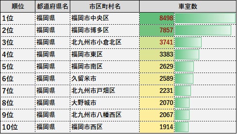 7位の北九州市戸畑区、8位の大野城市、10位の福岡市西区は、駐車場の“数”としては多くないにもかかわらず、車室数でTOP10入りしています。