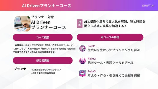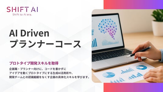 「日本をAI先進国に」を掲げ、AIのビジネス活用を学べる利用者数No.1※のAI大学「SHIFT AI」を運営する株式会社SHIFT AI(東京都渋谷区、代表取締役:木内翔大)は、企画職・プランナー向けのeラーニングコース「AI Drivenプランナーコース」を2025年8月8日より提供開始します。本コースでは、ChatGPT、Copilot、Geminiなどの汎用チャット型生成AIと、プロトタイピングAIツール「Lovable」を組み合わせ、コードを書かずにアイデアを動くプロトタイプにする具体的な手法を学びます。企画段階からプロトタイプを同時生成することで、開発チームとの認識齟齬をなくし、意思決定の質と速度を飛躍的に向上させるスキルを体系的に習得できる内容となっています。