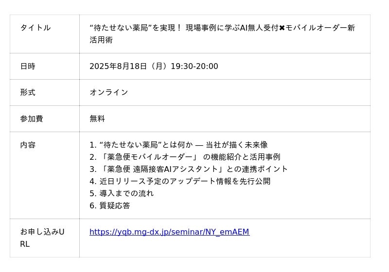 株式会社サイバーエージェント(本社:東京都渋谷区、代表取締役:藤田晋、東証プライム市場:証券コード4751)の連結子会社である医療AIカンパニー、株式会社MG-DX(本社:東京都渋谷区、代表取締役社長:堂前紀郎、以下「当社」)は、オンラインセミナー「“待たせない薬局”を実現! 現場事例に学ぶAI無人受付×モバイルオーダー新活用術」を2025年8月18日(月)に開催いたします。