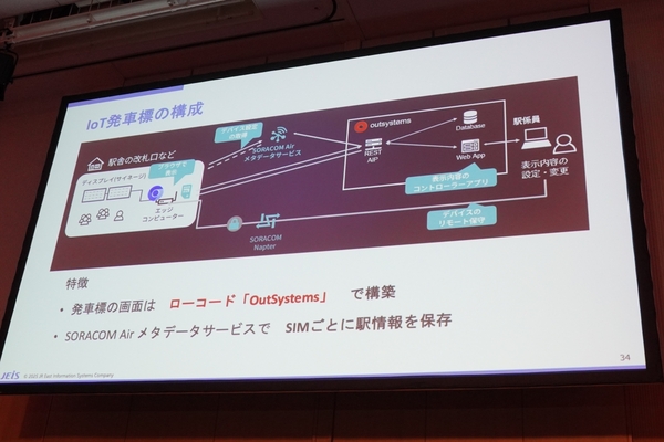 なお、発車標の画面となるWebアプリケーションは、他のインフォメーションIoTを含め、ローコードプラットフォームの「OutSystems」で構築している。かつて作成した混雑情報サービスはラズパイ上で動くアプリケーションで済んでいたが、今回はアプリケーションを稼働させるクラウドサービスを開発・運用する必要があった。aPaaSとしてプラットフォームの管理が不要で、フローの組み合わせでのみで開発も容易になることからOutSystemsを採用したという。