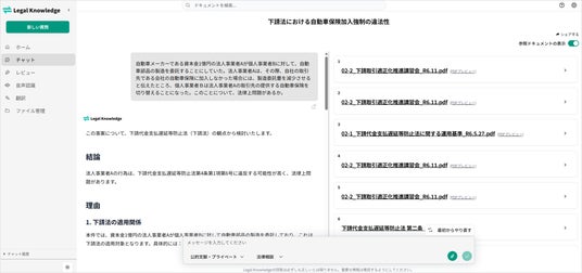 「Legal Knowledge」は、あらゆる弁護士業務の効率化を支援する生成AIサービスです。主なユースケースとして、法律相談や法律文書のドラフト作成、レビューが挙げられ、AIに指示をするだけで、当社内の弁護士が業務で活用すると判断した「信頼できる」公的な文献と、利用者自身が過去に作成した「信頼できる」過去案件のデータベースを参照情報として表示しながら、迅速に回答が生成されます。