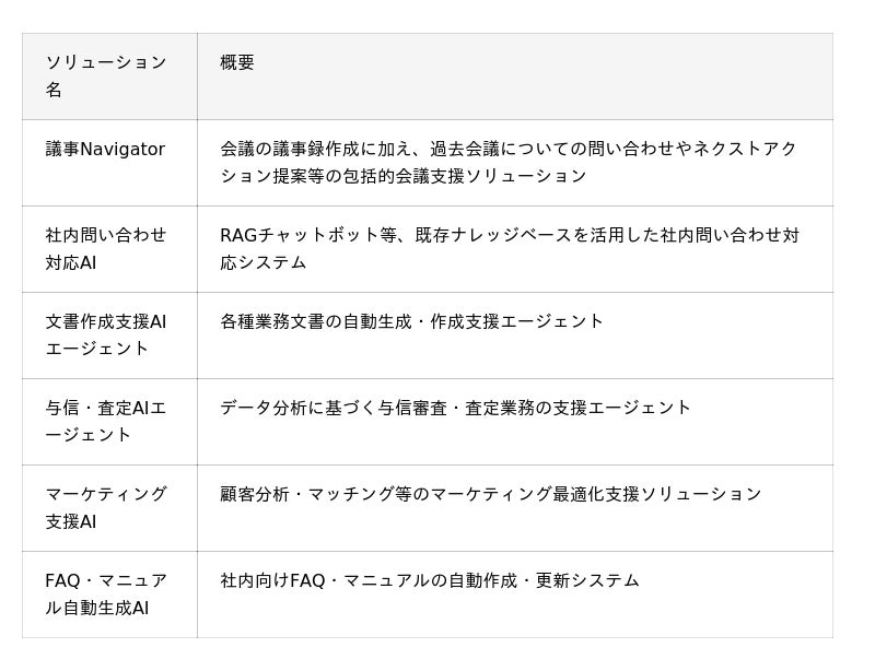 当社では、企業の具体的なユースケースに応じた業務特化型AIアプリケーションを提供しています。主要なソリューションは下表の通りです。各ソリューションの詳細については、当社ソリューションページをご参照ください。