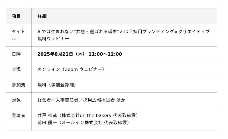 株式会社on the bakery(本社:神奈川県横浜市、代表取締役:井戸裕哉)は、2025年8月21日(木)にオンライン開催する無料ウェビナー「AIでは生まれない“共感と選ばれる理由”とは? 採用ブランディング×クリエイティブ」 において、事前予約者全員に、採用募集団の拡大と会社説明会の参加辞退率低減を実現する実践アイデアをまとめたPDF資料(限定配布)をプレゼントいたします。