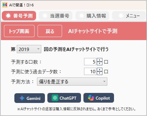 この機能では、「ChatGPT」や「Gemini」などの「AIチャット」に次回の当選番号を予測させるための「プロンプト」を作成します。