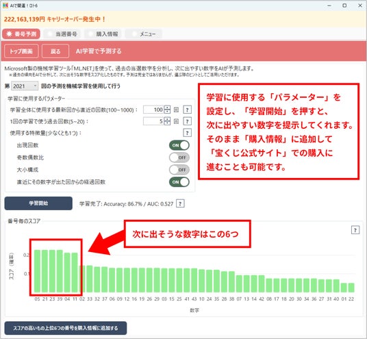 「AI学習で予測する」モードでは、Microsoft製の機械学習ツール「ML.NET」を使って、過去の当選数字を分析し、次に出やすい数字を予測します。