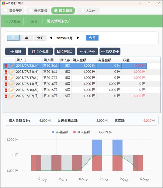 また、予測で算出された数字をそのまま「宝くじ公式サイト」に流し込み、ロト6の購入までを同じ操作画面内で行えたり、ロト6購入による収支をグラフで確認できたりなど、ロト6をとことん楽しんでいただくための機能を多数搭載しております。