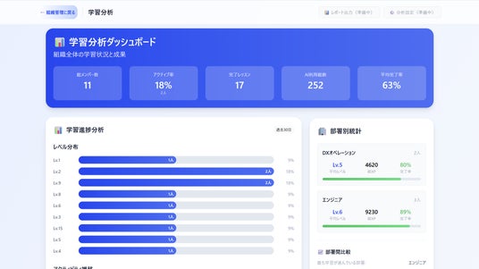 法人向けプランでは、従業員のAIスキル育成を強力にサポートする管理者機能をご利用いただけます。管理者は専用ダッシュボードから、各スタッフの学習進捗状況やAIスキルの習熟度レベル、サービスの利用状況などを一元的に把握・管理することが可能です。