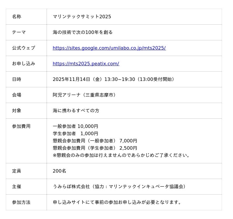 三重県志摩市を拠点に、地域内外のひとびとをつなぎ、社会課題の解決を支援するうみらぼ株式会社は、さまざまな海洋技術(マリンテック)の挑戦者と海にまつわる課題解決を目指すイベント「マリンテックサミット2025」(以下「MTS2025」)を2025年11月14日(金)に開催いたします。