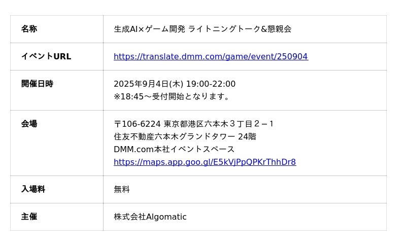 株式会社Algomatic(本社:東京都港区、代表取締役社長:大野 峻典、以下Algomatic)が開発・提供する、独自の翻訳AIを活用したゲーム特化翻訳サービス『DMM GAME翻訳』は、2025年9月4日、『生成AI×ゲーム開発 ライトニングトーク&懇親会』を開催することをお知らせいたします。