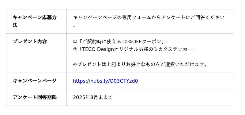 期間中、アンケートにご回答いただいた方の中から抽選で47名様に「ご契約時に使える10%OFFクーポン」または「TECO Designオリジナル労務のミカタステッカー」をプレゼントします。