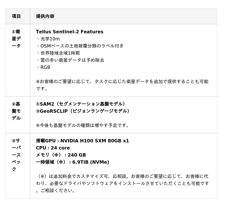 本サービスでは、学習データセットとして「Tellus Sentinel-2 Features」、搭載GPUとして「NVIDIA H100 SXM 80GB 」、さらに衛星データ向けの基盤モデルの利用が可能です。