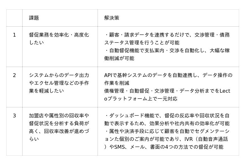 サービスラインナップの拡大に伴い、利用者も増加していくなかで、業務量の増加や煩雑化、さらには進捗管理の複雑化などの課題がありました。これらの課題を解決するために、業務の自動化およびデジタル化に加え、効果分析により効率的な社内体制の構築をすべく債権管理(顧客管理)から督促回収、交渉管理までをワンストップで改善できる「Lectoプラットフォーム」を導入いただきました。