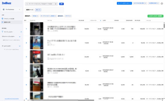 - トレンドの最速キャッチアップ: 独自の分析により、直近で再生数が急上昇しているコンテンツの傾向を特定。そのフォーマットを模倣し、自社アカウントのテーマに最適化することで、効率的にバズを生み出します。
