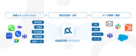 「amptalk analysis」は、携帯電話やテレビ会議システムなどあらゆるコミュニケーションツールと連携し、オンライン・オフライン関係なく商談や通話を自動で書き起こし・要約・解析し、Salesforce / HubSpot / Slack / MicrosoftTeamsチャットに自動出力することで、商談に関わる業務を自動化・可視化します。