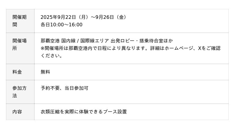 洋服などの衣類を “手のひらサイズ” に圧縮するサービスが体験できる実証実験を、那覇空港で9月22日(月)から9月26日(金)まで開催