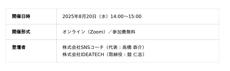 2025年8月20日(水)、株式会社SNSコーチと株式会社IDEATECHの共催により、「PR × SNS活用」によって問い合わせと採用力を高める勉強会が開催されました。