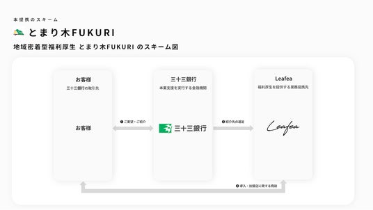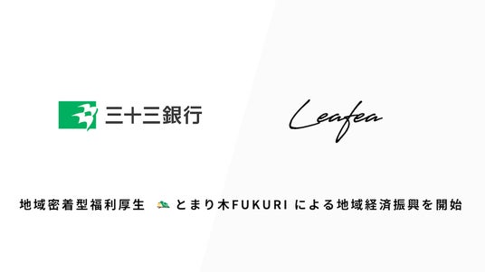 地域密着型福利厚生サービスを提供する株式会社Leafea(本社:東京都中央区、代表取締役:森田 渉、以下リーフィ)は、三十三銀行(本店:三重県四日市市、取締役頭取:道廣 剛太郎)と提携を開始します。9月1日(月)より地域密着型福利厚生サービス「とまり木FUKURI」の取扱を開始し、地域創生と日々頑張る方の支援を目指します。