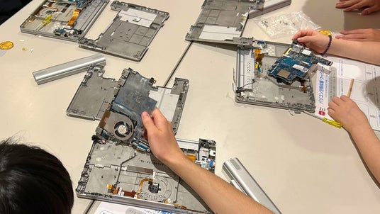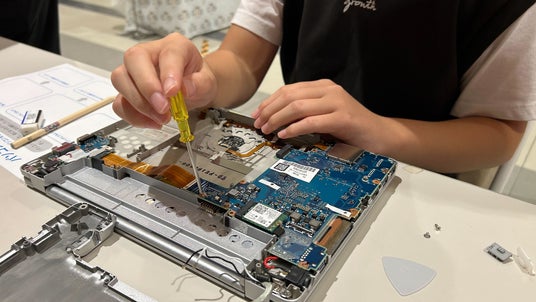 参加者はドライバーと三角ピックを使いながら、キーボード裏の基盤(CPUを冷やすファンやWi-Fi接続部分など)、そして液晶板の裏側までを実際に分解。普段は触れられないパソコンの内部構造の分解・組立を体験し、親子で一緒に驚きと発見を共有しました。