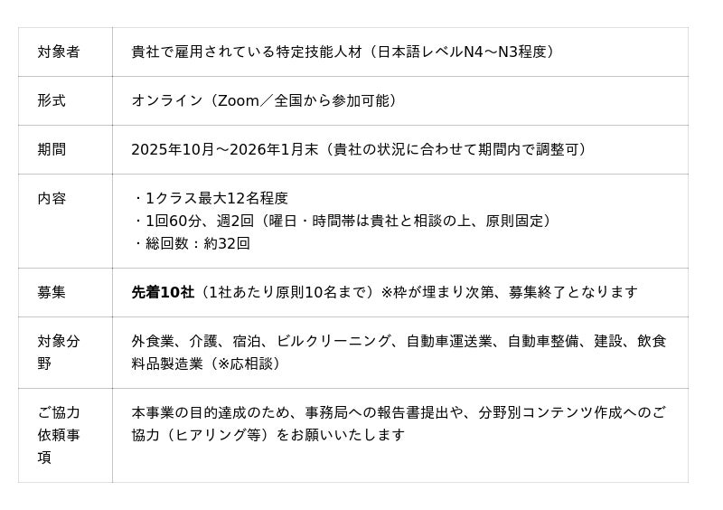 本採択を受け、特定技能ビザで就労する外国人材を雇用する企業を対象に、各分野に特化した実践的な日本語レッスンを無料で提供するモニタープログラムの参加企業を募集しています(先着10社・枠が埋まり次第終了)。