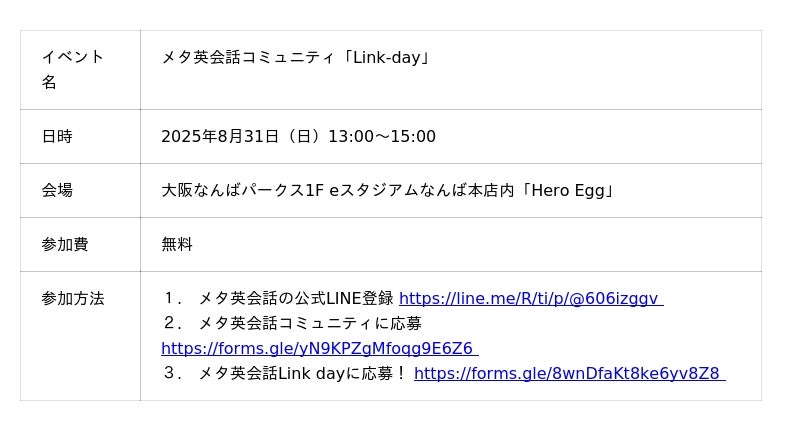 株式会社Meta Heroes(本社所在地:大阪府大阪市、代表取締役:松石和俊、以下:「当社」)は、オンラインゲーム(eスポーツ)やメタバースを活用したユニークな英会話コミュニティ「メタ英会話」の第一歩として、初のリアル対面イベント「メタ英会話Link-day」を2025年8月31日(日)に大阪・なんばパークスにて開催いたします。