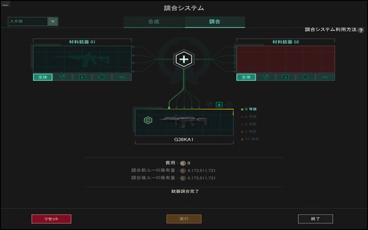 新たな武器合成システム「調合システム」では、対象の銃器Aと銃器Bの組み合わせから、対象の銃器Cを生成する事が可能です。