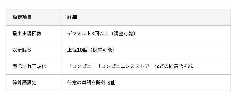 任意の自由回答カラムを選択するだけで、出現頻度に応じた文字サイズでワードクラウドを自動生成されます。助詞・助動詞の除去や、「コンビニ」「コンビニエンスストア」といった表記ゆれの正規化、「わからない」「特になし」などのノイズ語除外により、意味のある単語のみを抽出します。
