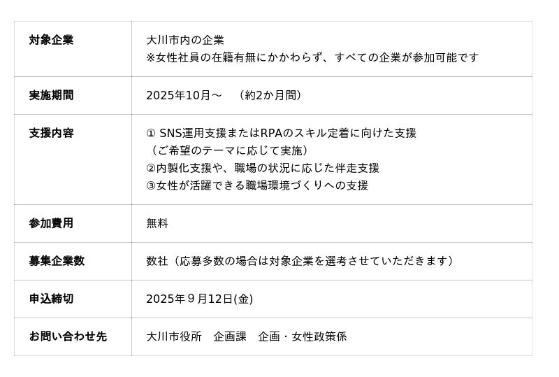 本プログラムは大川市のデジタル人材育成事業の一環で、「働きやすい・働きたいと思える職場環境づくり」を目指し、企業の業績向上や業務効率化の実現とあわせて、女性が活躍しやすい環境づくりに向けたデジタル活用の支援を行います。