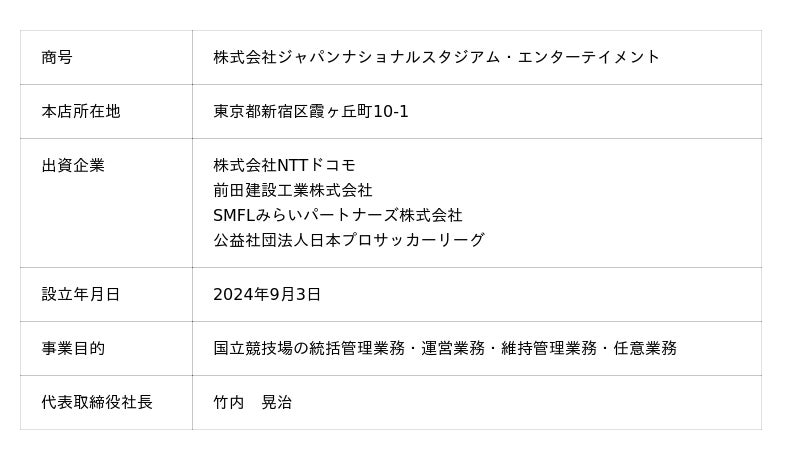 当社は、2025年4月より新たに国立競技場の運営事業を担う特別目的会社として、株式会社 NTT ドコモ、前田建設工業株式会社、SMFL みらいパートナーズ株式会社、公益社団法人日本プロサッカーリーグの4社による出資のもと設立されました。