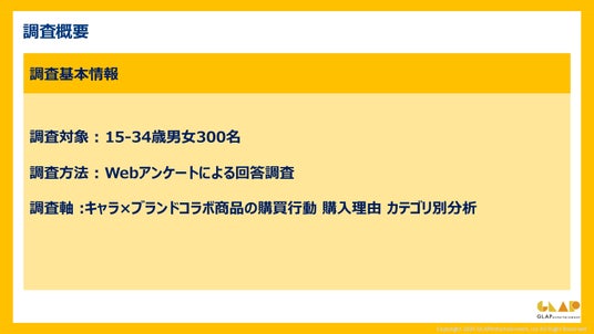 株式会社GLAPentertainment(東京都渋谷区、代表取締役:坂本大輔)は、近年、アニメやゲームなどのキャラクターとブランドがコラボレーションした商品が市場で注目を集める中、どのような要素が消費者の購買行動を促進するのか、その成功法則を明らかにするため、15歳から34歳の男女を対象とした独自調査を実施いたしました。