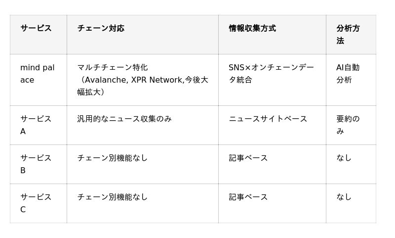 既存のWeb3情報サービスは、単純な情報配信に留まっているものが多く、個人最適化やAI分析機能を本格実装したプラットフォームは限定的です。