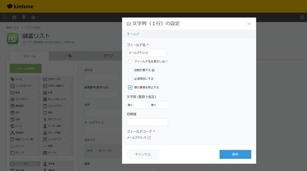 従来との違いを確認しやすいように、この記事でも『「顧客リスト」の「メールアドレス」をUpdate 判断のkey(updateKey)として利用するために「メールアドレス」フィールドを「重複禁止」に構成した状態で、「メールアドレスをupdateKey」「会社名をUpsert 対象のフィールド」として指定して一括Upsert を行う場合』を例に設定していきます。